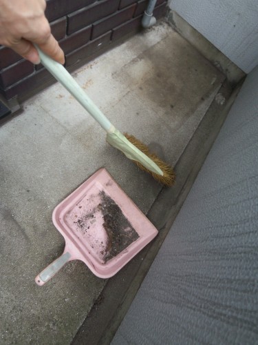 03 Published 2014年7月8日 at 375 × 500 in ベランダ床のコケを消す × 3.できるだけこの段階で取っておくのが大事。水で排水溝に流すとドロドロになって掃除が大変になります。